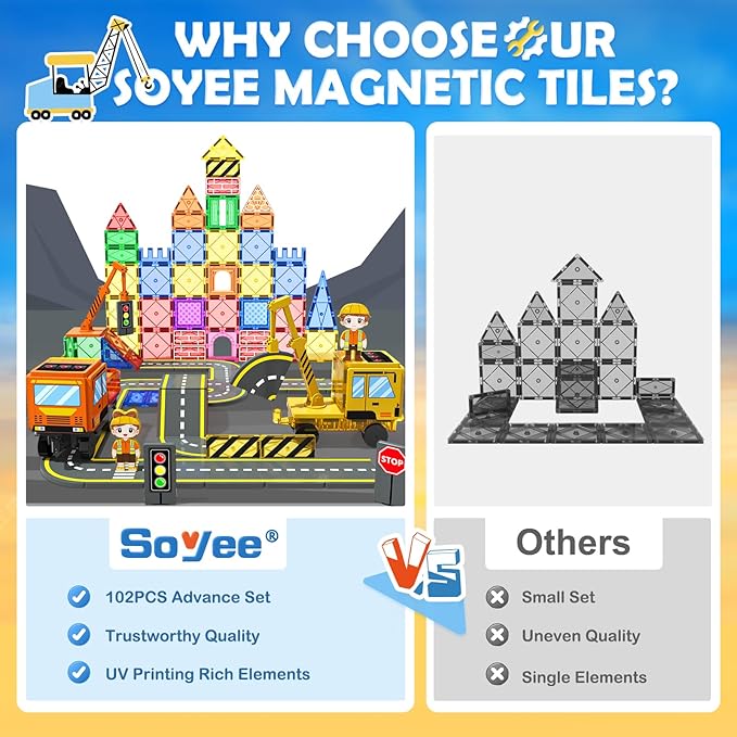 - 【QUALITY YOU CAN TRUST】 SOYEE magnet toys are made of ABS material and use stronger magnets. The set contains rich elements such as cranes, engineering vehicles, roads, traffic lights, enclosures, and magnetic figures. The crane magnetic tile can be rotated and telescopic, which is extremely operational