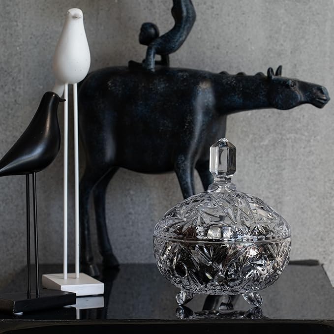 - Crystal Glass Candy Dishes with Lid: Vintage embossed design, Candy jars for Candy Buffet Containers. Storage Box Size: H 7-2/4" Diameter 6-1/4"(H 18.8cm Diameter 15.9cm) vintage and refinement, easy to place on the dresser. These decorative bowls with lids feature a clear, crystal-like appearance that adds a touch of elegance to any desktop decor.