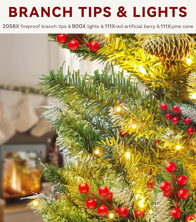 DWVO 9FT Pre-lit Christmas Tree, Pre-Decorated Artificial Christmas Trees for Home, Office, Party with with 2058 Flocked Frosted Tips & 900 UL Listed Lights, Pine Cones, Berries