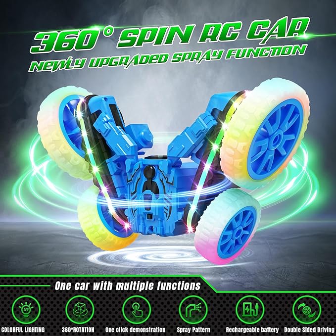 - 【Spray & Light】Newly upgraded spray function, just use a water bottle to add 30ml of water into the RC car's water tank to produce spray, unique and cool linear light design makes your car become the most eye-catching presence, spray and light can spray colorful spray at night, bringing you a fun experience different from other stunt cars.