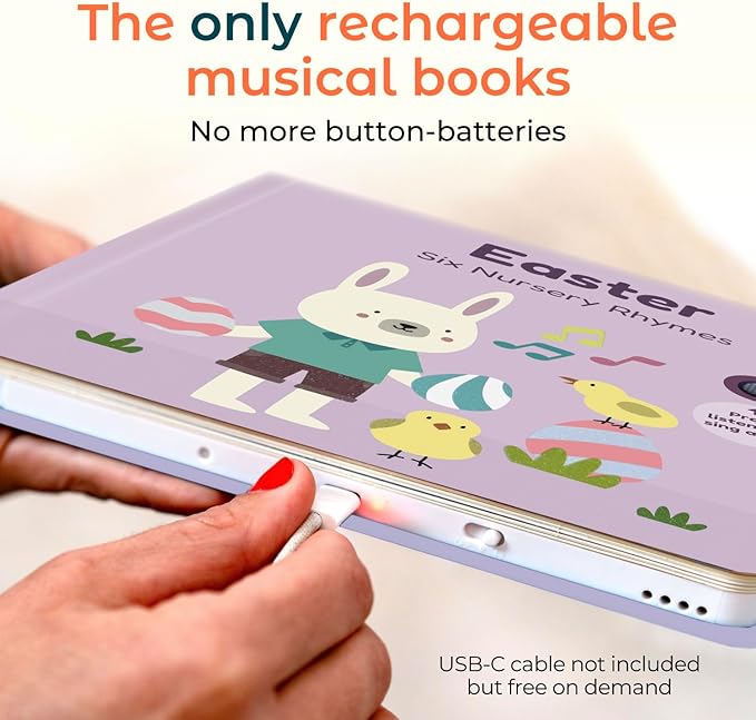 - USB-C rechargeable & lifetime warranty – No more disposable batteries! This Easter musical book features a USB-C rechargeable battery, providing convenience and long-lasting use. Plus, enjoy peace of mind with our lifetime warranty—we stand by the quality of our books.
