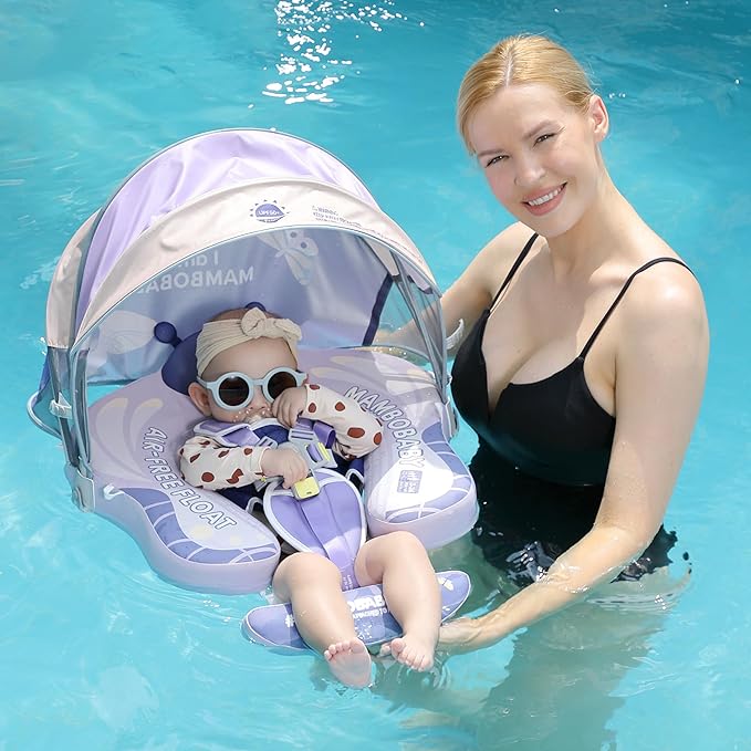 Mambobaby Float Add Tail Baby Swim Float with Canopy Solid Pool Infant Swim Trainer Swimming Training Lying Air Free Water Floats Non-Inflatable Waist Swim Ring for Toddlers (Butterfly-Purple)