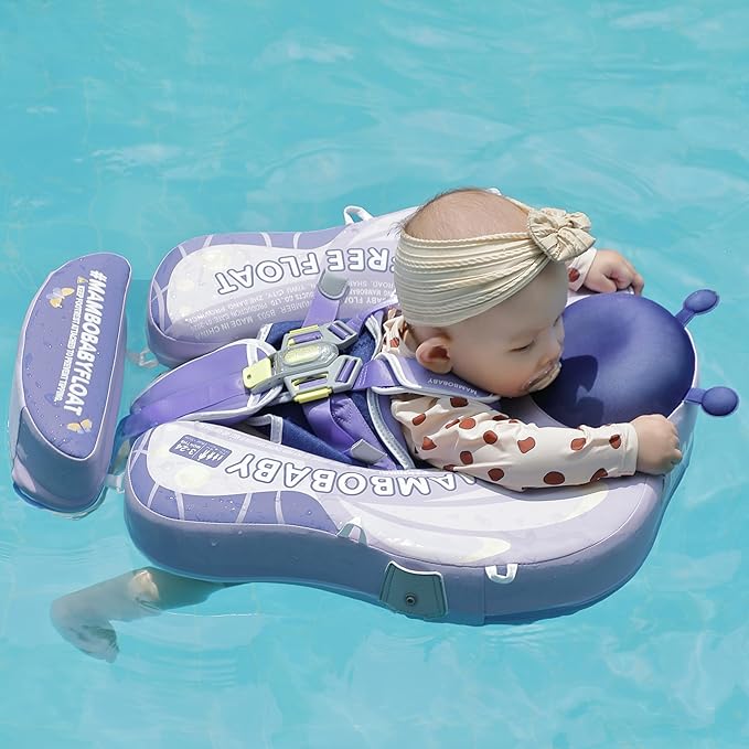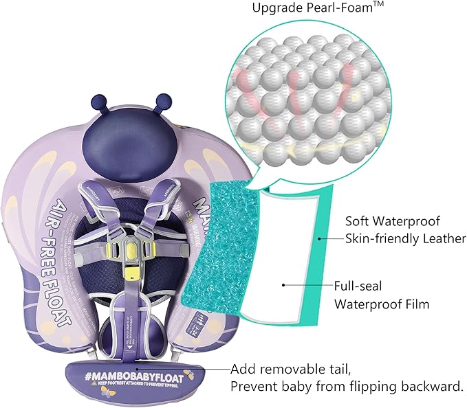 - 【360° FULL PROTECTION】Add removable tail, Prevent baby from flipping backward. Upgraded safety buckle, The Upgraded safety buckle provides 5 support points and perfect 40°angle to keep a balance to avoid baby flip over and fall off. Upgraded into 2 swim ways which are backstroke and breaststroke with different buckle method. Backstroke Suitable for 3~6months baby, breaststroke Suitable for 3~24months baby.