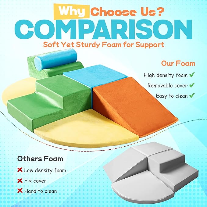 - High-Quality Materials: Crafted from durable high-density foam, our climbing toys for toddlers 1-3 inside are designed to withstand active play for little adventurers. The toddler foam climbing set provides superior stability and support, making it the perfect choice among toddler foam climbing blocks. Create an engaging baby climbing gym at home where your child can explore, develop motor skills, and build confidence through safe, imaginative play! Please allow 24-48 hours for the foam to fully expand from packaging.