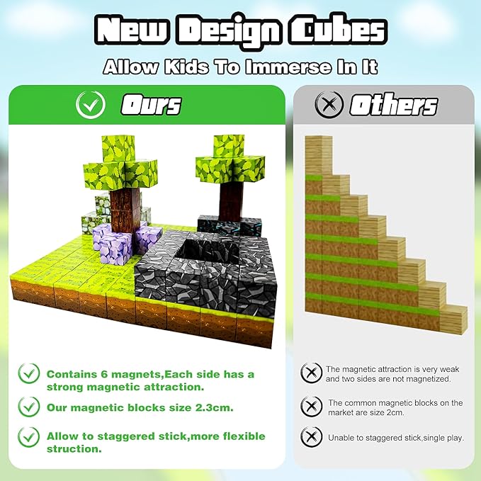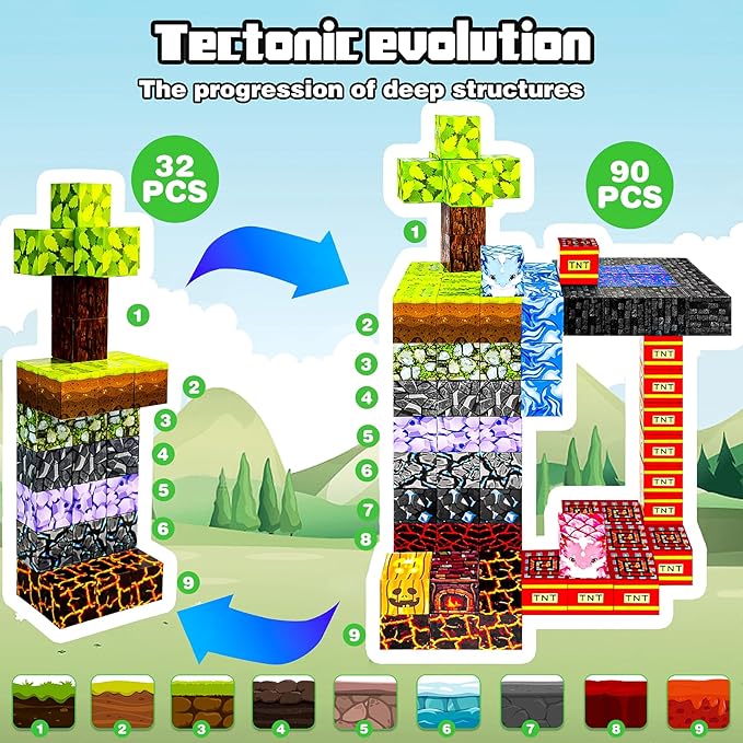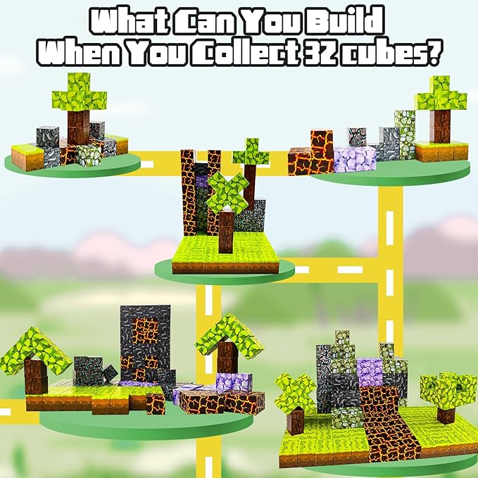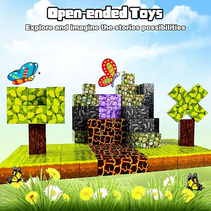 - 【32pcs Building Blocks 】This magnetic building toy offers multiple play options that ignite children's imagination and serve as an excellent educational tool to foster creativity. With vibrant scenes such as lush forests or flowing lava rivers, it helps children develop a strong sense of color, art, geometry, and structure.