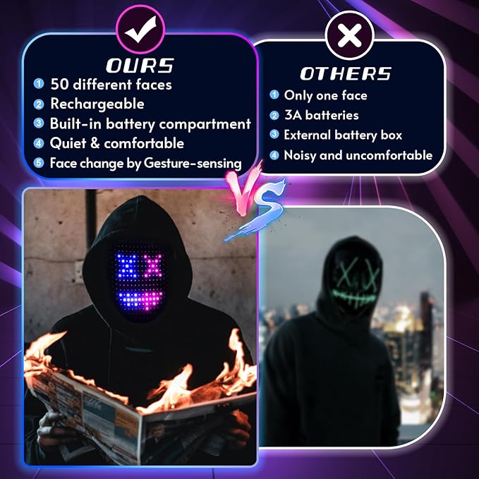 - Gesture Sensing Face Swap: Instantly transform your look with a simple hand swipe. This light up mask offers an interactive experience that ensures you stand out at any event.