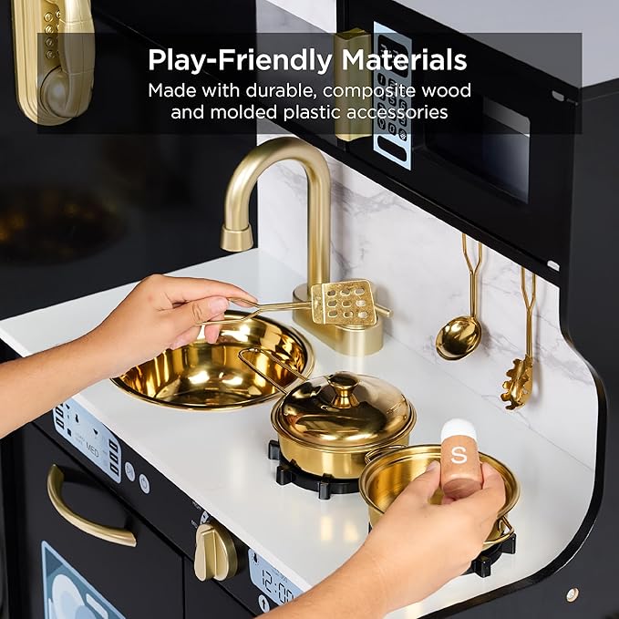 - TRUE TO LIFE KITCHEN: Your child can get a true experience with features like a towel rack and ice machine, and realistic sounds like the "click" of the oven knobs as they pretend to bake and cook in a designer kitchen with a modern backsplash