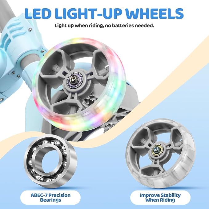 - 【Smooth Light PU Wheels】: The wheels light turns on automatically when riding and stops glowing when the wheels stop turning without batteries required. These lights come in various colors, ensuring your kick scooter stands out wherever you go. Our scooter PU wheels ensure a comfortable glide on all surfaces