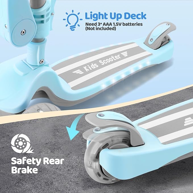 - 【Light-up Deck】: Features light-up deck, The lights can be turned on/off with a button at the bottom of the deck, Adding an extra element of fun and visibility to outdoor play, The child playing more happily and parents feel more at ease. (Remark: 3*AAA 1.5V batteries need to be prepared)
