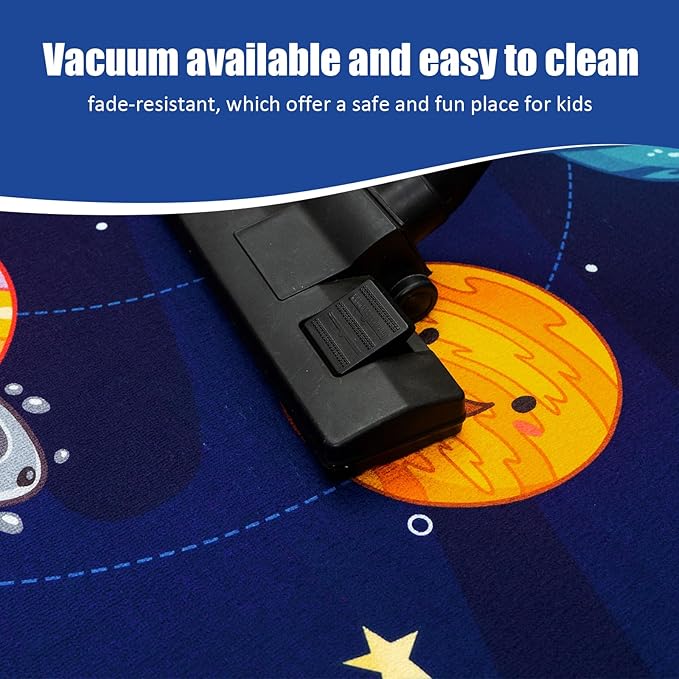 - INSPIRE CHILDREN'S CURIOSITY ABOUT SPACE :Featuring beautiful images of the planets and space, this playroom rug vibrant colors and detailed illustrations capture children's imaginations and encourage them to ask questions about the planets and the vastness of space.This kids play rug can be used as a stepping stone for further exploration and learning about astronomy,inspiring children to delve deeper into the mysteries of the universe.