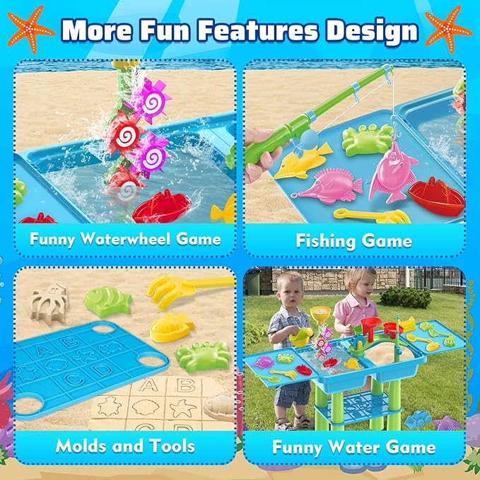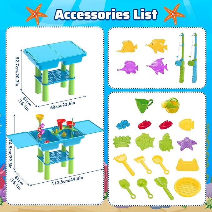 - Large Sand and Water Table: deAO upgraded large Water Play Table Size:20"*24"*16":Expand Size: 30"*16"*44"is suitable for toddlers and kids.This summer water toy set comes with lots of beach toys accessories for kids to play in a variety of ways, such as Separate design for sand and water,swinging water wheels,shovels and rakes, 2 fishing rods and seafood molds.The lid of the sand and water table opens to hold accessories.