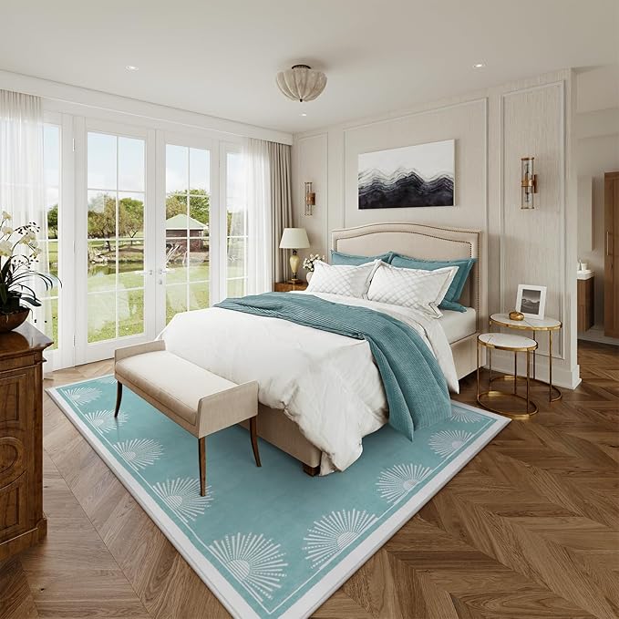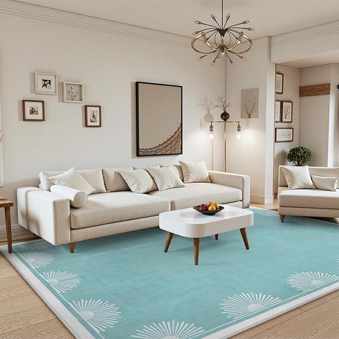Modern Bedroom Rug 8x10 Under Bed, Low Pile Teal Washable Rugs for Living Room,Soft Sun Printed Large Rug,Aqua Dining Room Rugs for Under Table Classroom Dorm(8x10ft,Teal)