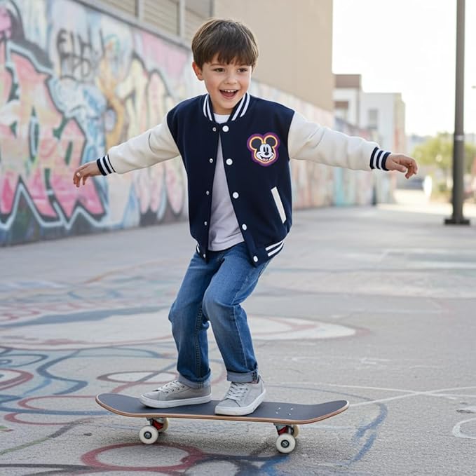 - Charming & Stylish Design: Keep your little one cozy and trendy with this Disney Mickey Mouse varsity jacket! Featuring a classic Mickey patch with a colorful twist, this navy fleece jacket with white sleeves and striped cuffs offers both comfort and style. Perfect for kids aged 3-10, it’s great for school, outdoor play, or any Disney event, combining warmth with a playful, iconic look