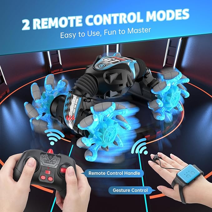 - 【2.4GHz Dual Remote Control】: Our rc car comes with a 2.4GHz remote control and a sensing watch, meeting the needs of people aged 8-80. The 2.4 GHz remote control is kids control friendly, very easy to use, which is suitable for beginners; The sensor watch is more challenging, you can hand gesture control rc cars by the sensing watch for a completely different sense of experience, suitable for children over ten years old.