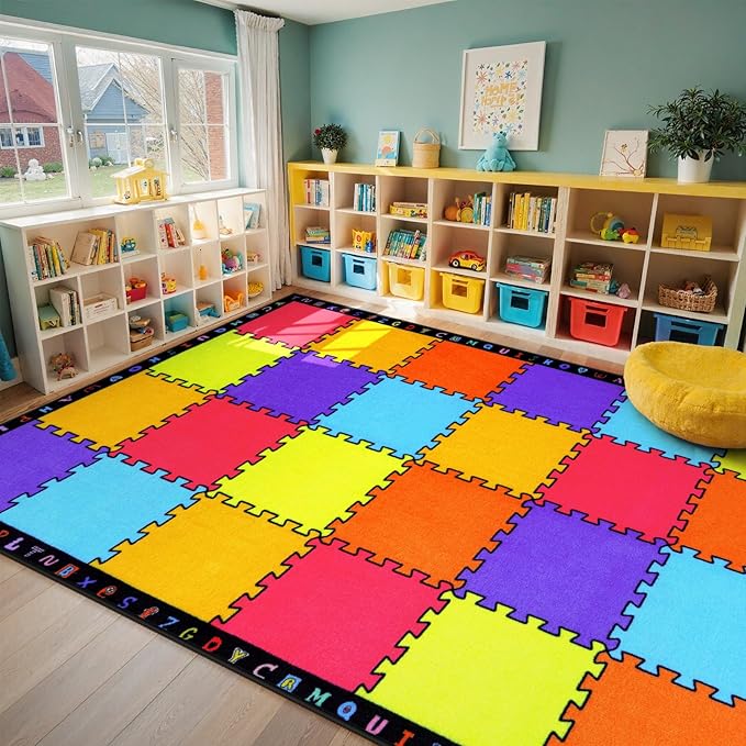LIVEBOX Classroom Rugs Elementary for Kids, Washable School Learning Area Rugs, Colorful Preschool Children's Classroom Carpet Non-Slip Playroom Rug for Home Learning, 13'x7'5"(Seats-24)