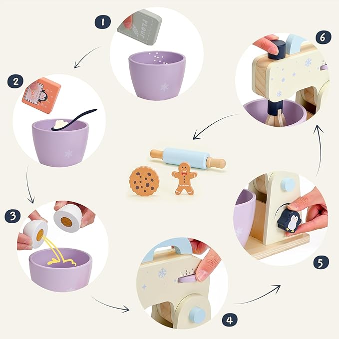 - Pretend Play Food Set: Including 1 classic mixer ,1 bowel, 1 egg, 1 flour, 1 sugar. moreover it has 1 rolling pin, 1 scale and 2 cookies. Kids will have much more fun and busy with this play kitchen mixer for hours