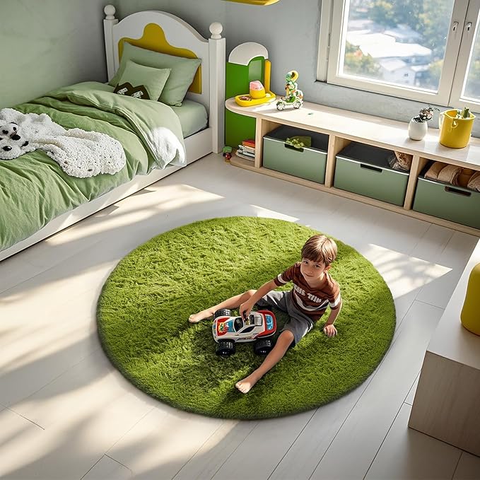 Ophanie Round Rug 4Ft Green Circle Area Rug, Green Room Decor, Fluffy Fuzzy Bedroom Carpet, Plush Soft Shaggy Living Room Rugs for Kids Home Decor Aesthetic, Nursery