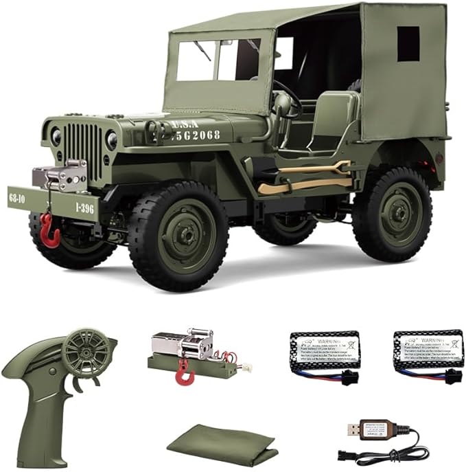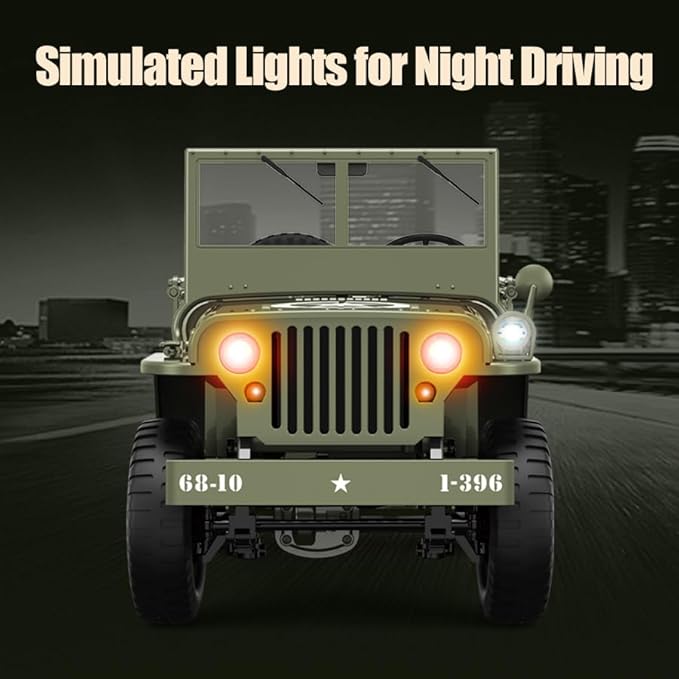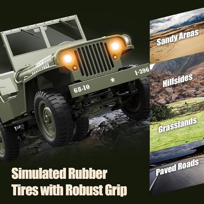 - [Great Gift] The 1/10 Willys MB Jeep RC car is designed with a simulated chassis. The material grain on the bottom is clearly visible, and the bottom details are scaled down from the real car. The highly realistic design supports outdoor control for enthusiasts. It’s a great collectible for enthusiasts and also a very interesting remote control car toy, making it an ideal birthday or Christmas gift for both boys and adults.