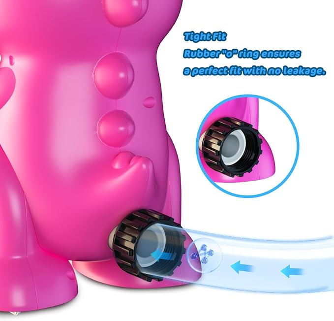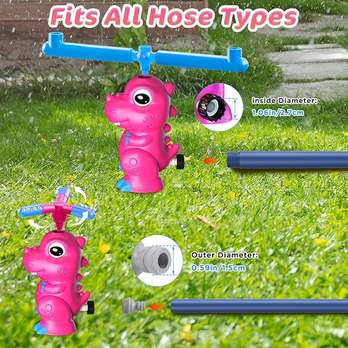 - 【Installation is a Breeze】Connect the nut(inner diameter 0.59in/1.5cm) of the dinosaur water toys directly to the threaded garden hose, OR simply use the included connector (outer diameter 1.06in/2.7cm) to connect the unthreaded hose. Easily Adjust the baseball height and water sprinkling range by controlling the water flow from your garden faucet.