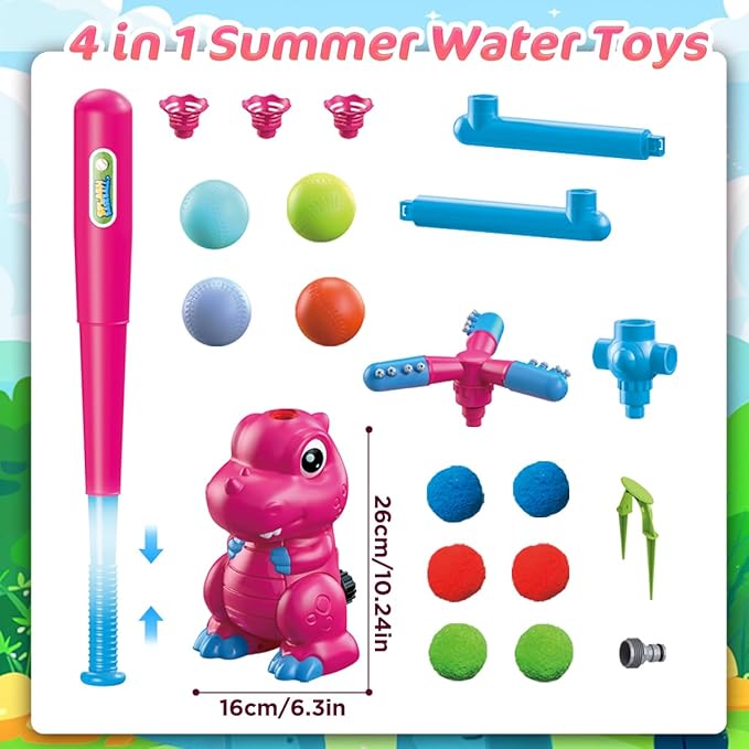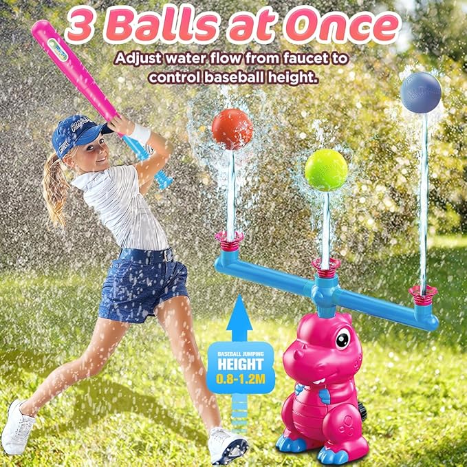- 【Triple the Hits, Triple the Fun】Watch your little baseball player's skills soar to new heights as they practicing with our dinosaur tee ball toys. Water Baseball toy's Tri-Ball Launcher launches three water balls at a time up to 80-100cm in heights! Grab your bat, aim, and swing—it’s a home run extravaganza that keeps the whole family laughing and splashing all summer long!