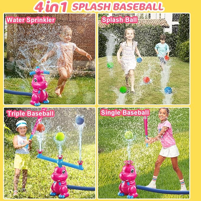 4-in-1 Dinosaur Water Sprinkler Baseball Toys, 360° Roating Spray Water Play Game, Water Splashing Toy for Kids Outdoor, Summer Backyard Lawn Pool Party Fun for Boys Girls (Pink)