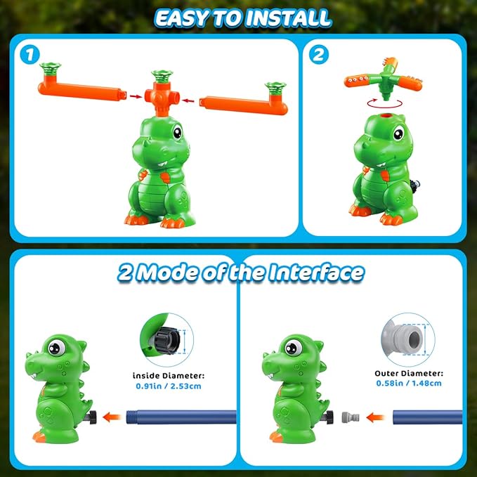 - 🦖UNIQUE DINOSAUR DESIGN - The dinosaur-shaped kids sprinkler features vibrant colors that make it stand out in any lawn. Its playful design includes rotating eyes that swing with the water pressure, creating fun expressions that kids will love. This dinosaur-themed kids' sprinkler for yard will capture your children's attention and spark their imagination, transporting them to a world of dinosaur adventures and providing hours of outdoor water play