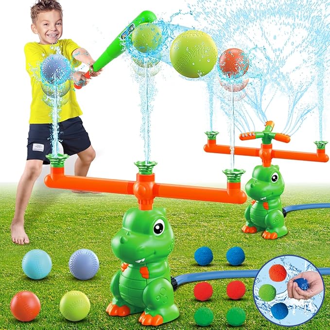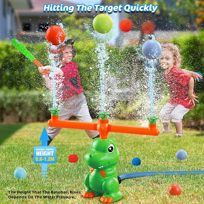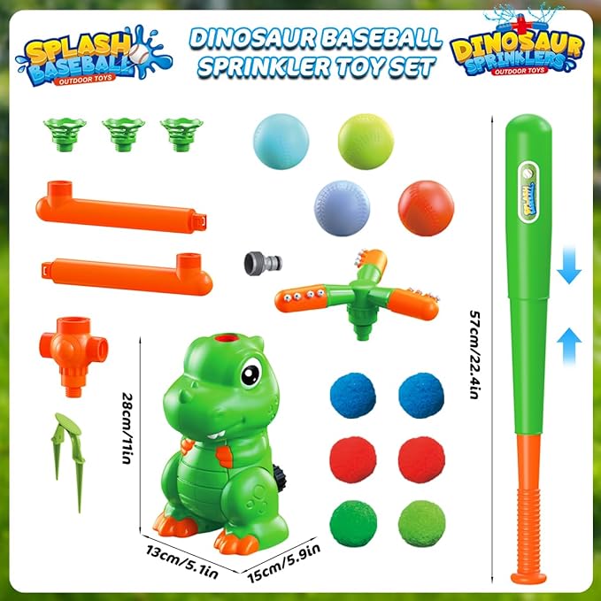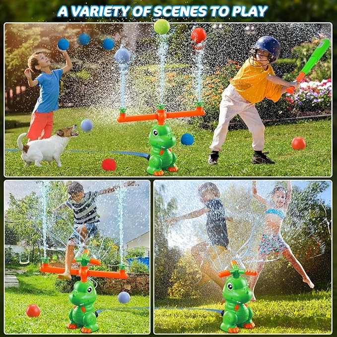 - 🔧EASY TO INSTALL - The water baseball sprinkler kit includes 1 x dinosaur body, 1 x sprinkler nozzle, 3 x water column nozzles, 1 x retractable baseball bat, 4 x baseballs, 6 x soft water balls, 1 x three-nozzle connector and 1 x ground stake. The sprinkler connector is designed to be compatible with universal interfaces, making it easy to connect to either a garden hose or a threaded water pipe. Simply connect to the water source, turn on the water and kids can enjoy the refreshing fun of summer