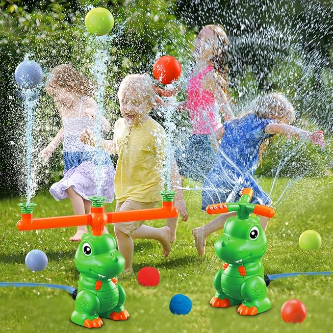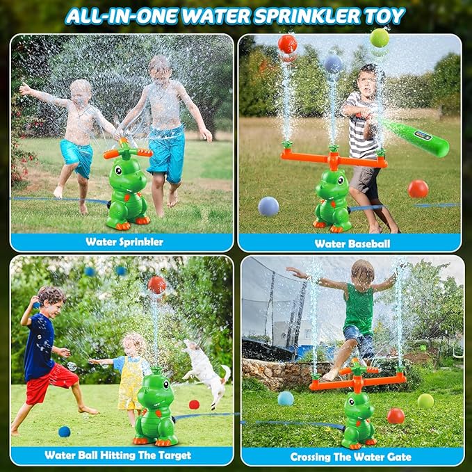 - 🌊4 IN 1 SPRINKLER FOR KIDS - This dinosaur water sprinkler combines the functions of a sprinkler toy, water ball and splash baseball for a varied and interactive play experience. Children can enjoy the refreshing coolness of the sprinkler, play interactive water ball games or practice their baseball swing. Meanwhile, the high spray columns on either side simulate the thrilling experience of passing through a water gate, adding to the excitement of playtime