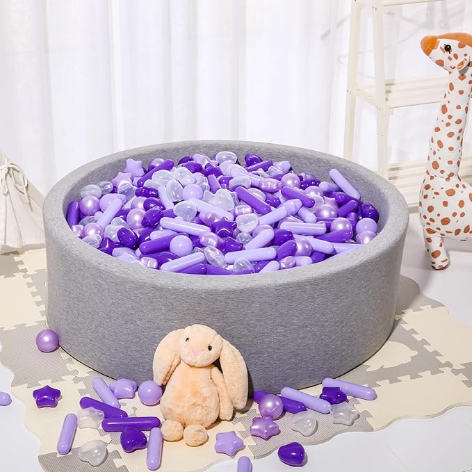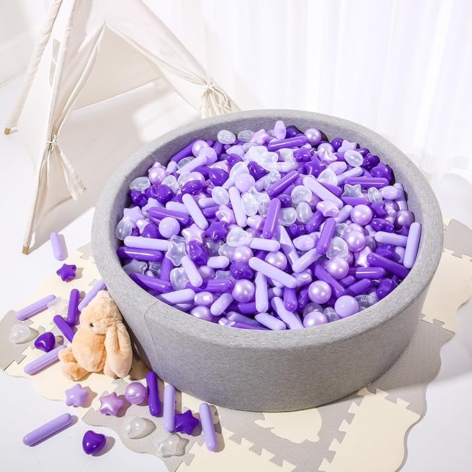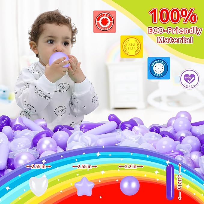 - KID FRIENDLY: Pack of 100 pcs toy Balls with 4 colors: purple,pearl purple,light purple,clear. Made of food grade PE material with phthalate free, BPA free, lead free and non-PVC plastic, non-toxic, no smell. Each pit ball is thickened, more durable, and more brightly colored. CPSC Test Report recommended Age:0+