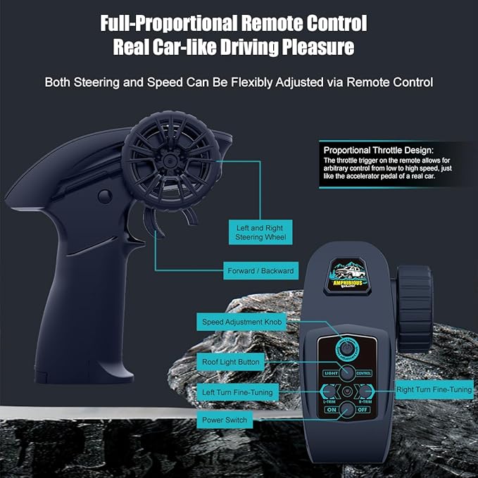 - Proportional Throttle and Steering: The Remote Control Crawler is equipped with a proportional throttle and steering system for precise control of speed and direction. This feature is essential for accomplishing complex controls in difficult terrain, providing a more realistic and enjoyable driving experience.