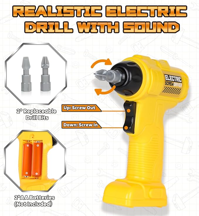 - ALL TOY TOOLS IN ONE: Includes kid-safe electric drill (2 drill bits), hammer, saws, wrenches & more. Drill designed for weak grip – easy to press button & low-speed rotation to prevent injuries