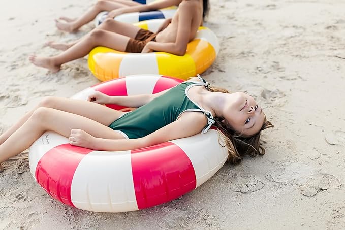 - LUXURY TOUCHES FOR ULTIMATE COMFORT: With soft inner seams and a handprinted striped design, this pool float kids option blends comfort with timeless style. Enjoy a smooth, skin-safe surface and safe air valves for easy inflation. Our pool floats for kids are thoughtfully made for worry-free lounging and play.