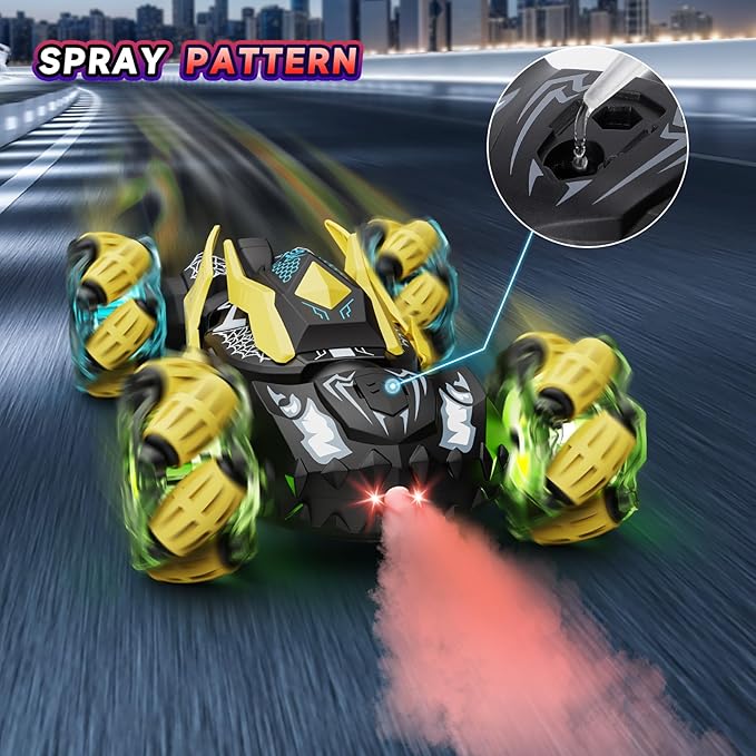 - 【Gorgeous Lights Paired with Smoke】 This twisting RC car features cool lighting effects and the front of the car can emit a spray of mist. While you floating you can spray mist, with the colorful lighting will make your special effects even more cool! Even at night or in low-light settings can you enjoy the dual visual and sensory stimulation.