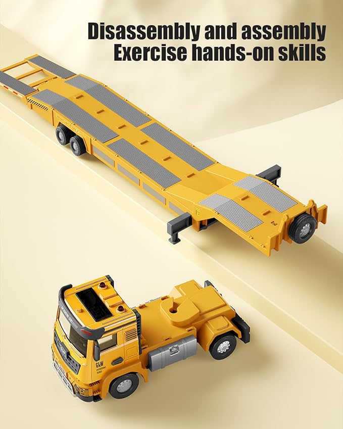 - Highly Restored Construction Vehicles Set - The construction toys set is highly restored to the 1:40 scale of the real truck. Press the button on the front of the vehicle to get 3 kinds of light and sound effects, and the support frame can be pulled out on the side of the semi-trailer truck to make the game no longer boring