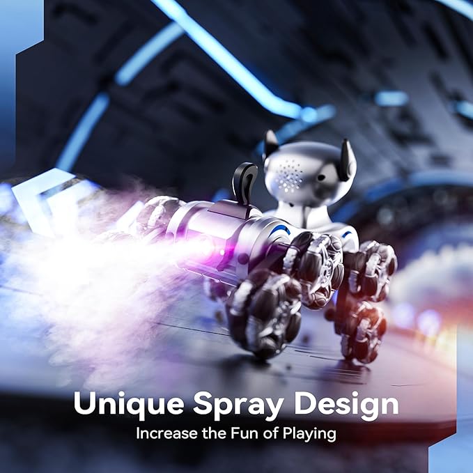 - Unique Spray Design ----- The tail of the robot dog is designed with a spray function, to increase the fun of playing. The back of robot dog has a water tank inlet, simply pouring the configured water in and click corresponding button that achieve misting function.