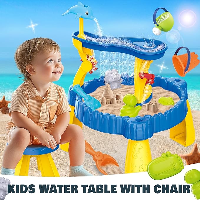 - Toddler Water Table With Rich Accessories: The water table comes with many beach accessories (spray bottles, chairs, buckets, sandbox spoons, molds, and various beach shovels). Plenty of games will keep your kids fresh for a long time, kids can splash water with buckets, and make sand animals out of models, what a fun summer