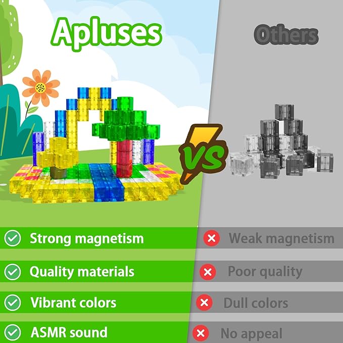 - 【Safe and Kid-Friendly Design】 Apluses magnet building cubes are made from high-quality, non-toxic ABS materials with smooth, rounded edges and a flat surface. They are odorless, lightweight, and designed to ensure safety and comfort for children during playtime. The strong magnetic force allows toddlers to easily connect and detach the cubes, making it simple for kids aged 4-8 to build stable structures. Compared to other toddler toys, this set stands out for its exceptional safety and usability, giving parents peace of mind.