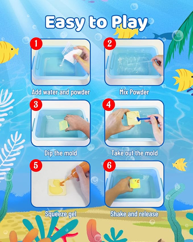 - Safe & Non-Toxic Materials: Made with eco-friendly, non-toxic materials. Our squishy aqua gel kit includes child-safe calcium lactate, safe magic gel, and smooth-edged molds. Parents can rest assured knowing their little ones are playing with safe and high-quality materials.