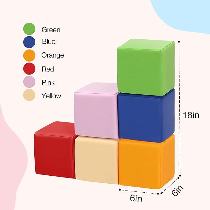 - Colorful Foam Blocks for Early Learning: Our 6-piece toddler blocks of foam cubes covered in durable, waterproof PU leather features vibrant colors designed to grab kids’ attention and foster early color recognition, creating a vibrant toddler zone to explore and learn through stacking, building, and imaginative adventures