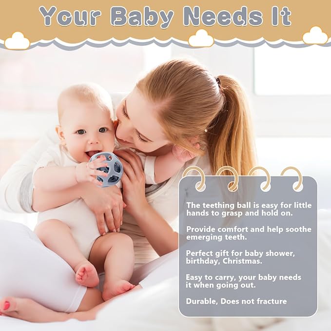 - 【Easy to Grasp & Hold】Designed with tiny hands in mind, this baby ball toy features a size and finger holes that's easy for infants to grasp, promoting motor skill development and sensory exploration. All teether balls do not have small part plugs to avoid the danger of choking hazard. Weight: 76g/2.68oz