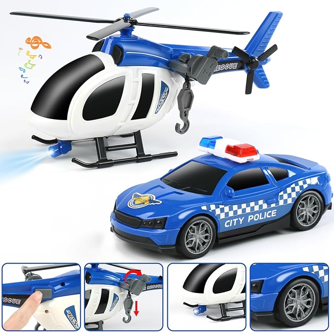 - SIMULATED WORKING SOUNDS AND LIGHTS:The towing engine and helicopter in our truck playset come with batteries installed.It features easily accessible buttons for toddlers,and we've also included simulated horns,working sounds,and headlights.