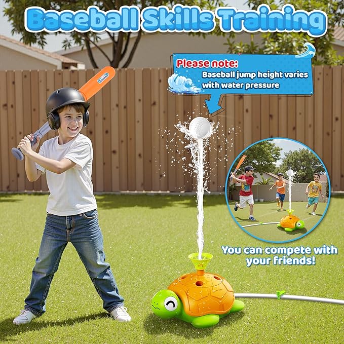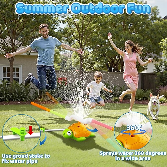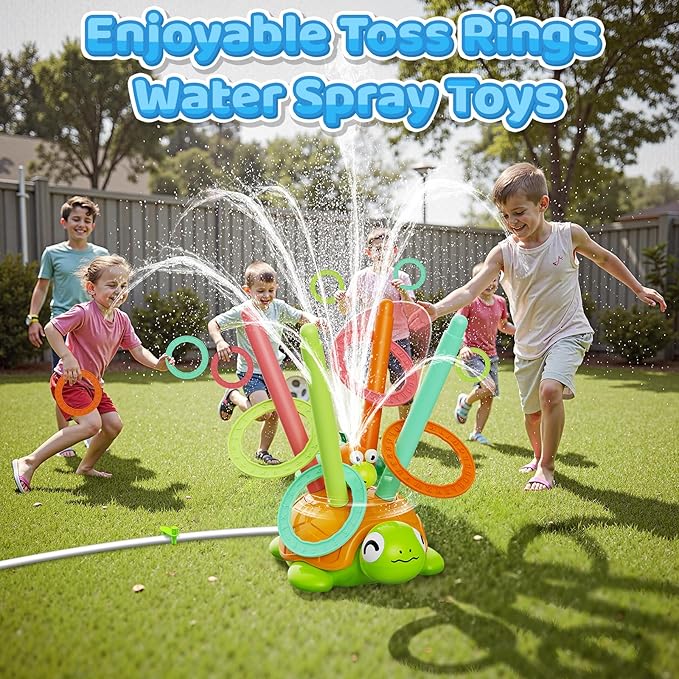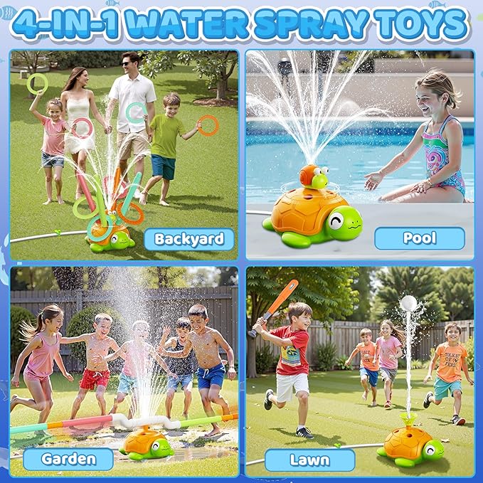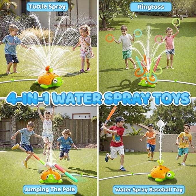 - 【4-in-1 Turtle Water Sprinkler Toys】Transform your yard, backyard, or lawn into a vibrant water playground! Our innovative turtle sprinkler offers 4 unique games: WATER SPRAY CHALLENGE, SPINNING POLE JUMP, ROTATING RING TOSS COMPETITION, and FLOATING BASEBALL BATTLE. Great water toys for kids, toddlers to teens will love assembling this tool-free setup using included connectors and stakes. Made with durable, high-quality materials for safe outdoor play at pool, park, or garden party fun!