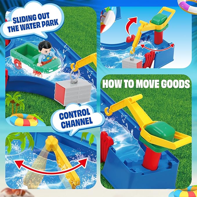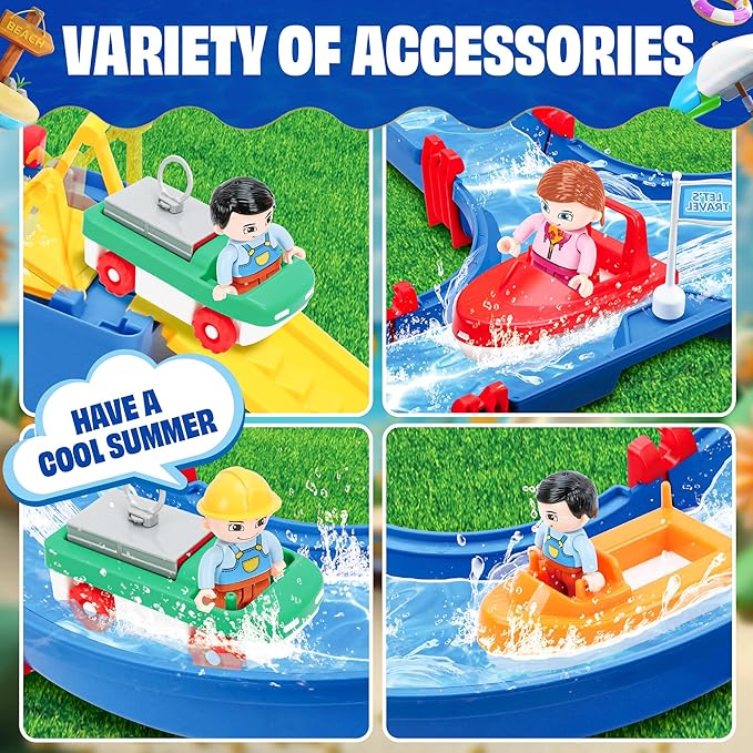 - Water Playset Outside Tpys : This summer water table set includes irregular orbit, water flow accelerator, surface landing gear, bridge, 2 container boat, 2 speedboats and 2 dolls. Kids can turn the water flow accelerator to make the water moves and boats through the canals, learn about the dynamics of water. Through the process of building bridge to help their toy boats cross the canal, kids can learn valuable lessons in adaptability and creative problem-solving