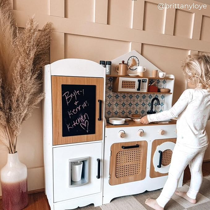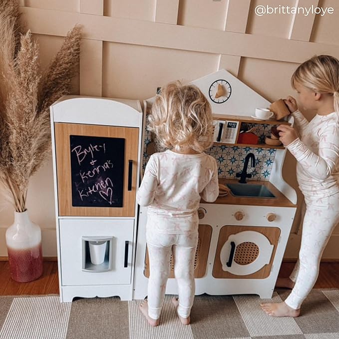 Teamson Kids Little Chef Morocco Play Kitchen with Chalkboard, Ice Dispenser, and 11pc. Accessory Set, White/Natural