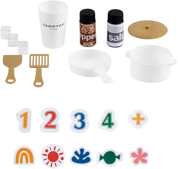 - ACCESSORIES INCLUDED: A pair of spatulas, a pot and pan with a universal lid, a cup with three ice cubes for the ice dispenser, pretend salt & pepper shakers, and a set of 10 colorful magnets