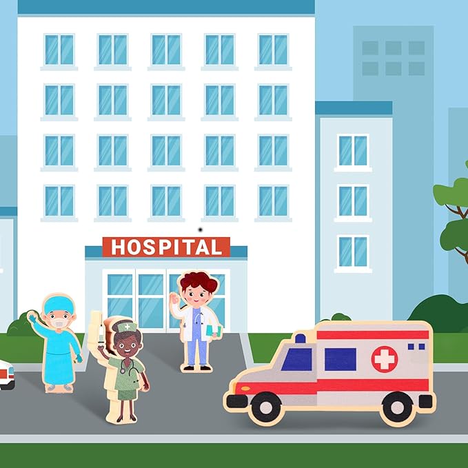 - Suitable Size: the smallest professional figures in this wooden block set measures approximately 2.6 x 1.4 x 0.48 inches/6.5 x 3.5 x 1.2 cm, with some figures being even larger in size; This suitable size allows kid's small hands to easily and comfortably grip; The size of a professional car is approximately 10.5 x 5 x 1.2 cm, perfectly matching the size of a little community helpers