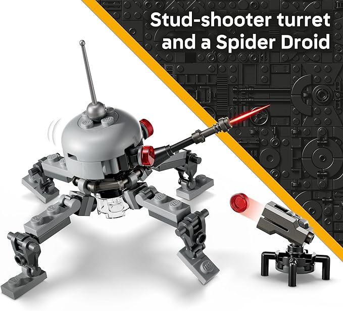 - BUILT FOR STAR WARS BATTLES – Kids can command an AT-RT walker with a LEGO minifigure cockpit, a stud shooter, and storage for a blaster and binoculars, as well as posable Spider Droid and stud-shooter turret