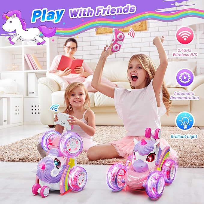 - 【Cool Unicorn Stunt Car】This electric remote control stunt car adopts 4D drive and drive on both sides; moving forward and backward,RC cars can make cool stunts. RC Car remote control is equipped with intuitive buttons and joysticks, allowing children to easily master the operation skills and start enjoying driving without complicated learning process.These remote control cars are adorned with seven brilliant colors and adorable unicorn designs, promising to deliver endless joy to children