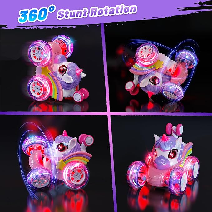 Carsky Unicorn Remote Control Car for Girls,360°Stunt RC Cars Rotation 4WD Remote Cars with LED Lights,Fun Indoor Outdoor Toys for Kids,Chritmas Easter Birthday Gift for 3 4 5 6 Year Old Girl