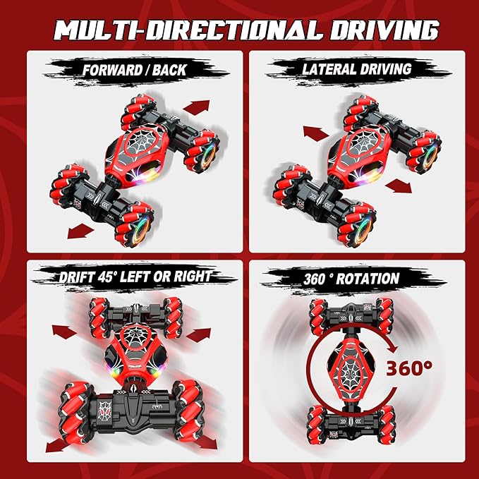 - Master Extreme Stunt Driving: Unleash limitless stunts with our spider gesture-sensing stunt car ! experience 360° spins, diagonal drifts, dual-side driving, and precise forward/backward movements,Kids can seamlessly switch between the Gravity Watch R/C and 2.4Ghz R/C for multi-directional control.